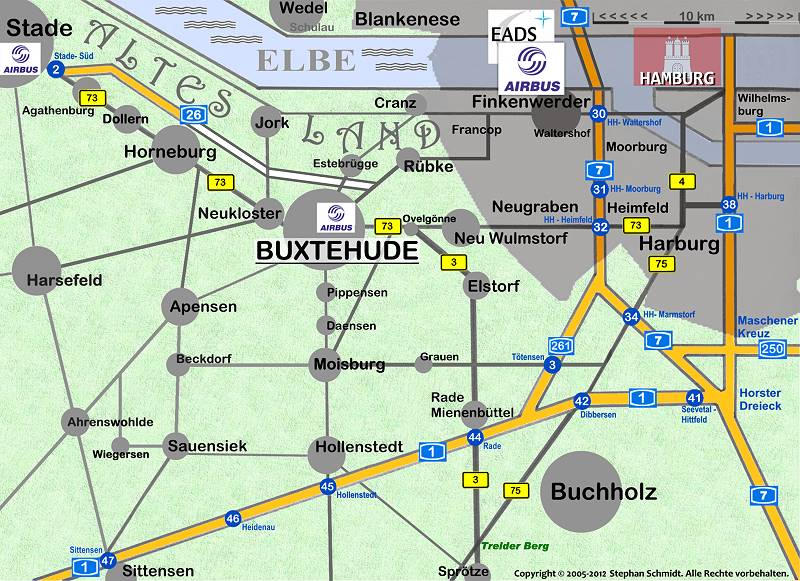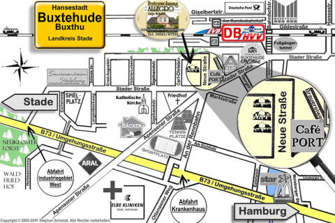 Anfahrt aus Richtung:HANNOVER/FLENSBURGWechselnSieam“HorsterDreieck”von derA7aufdieA1RichtungBremen. NehmenSiedanndieAbfahrtNr.44 “Rade”vonderA1.FolgenSienunder B3RichtungELSTORF,OVELGÖNNE+ nun Richtung BUXTEHUDE auf der B73.